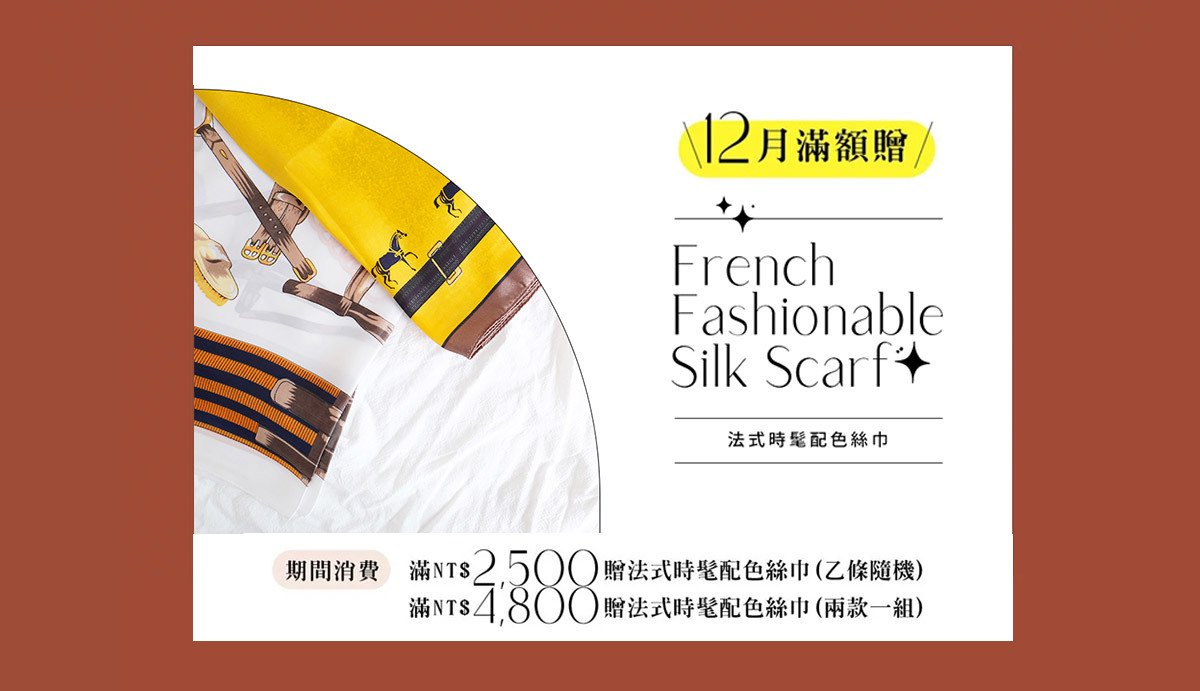 • 活動辦法 : 11/29 - 12/23 期間消費滿NT$2,800,即享抽獎機會乙次!