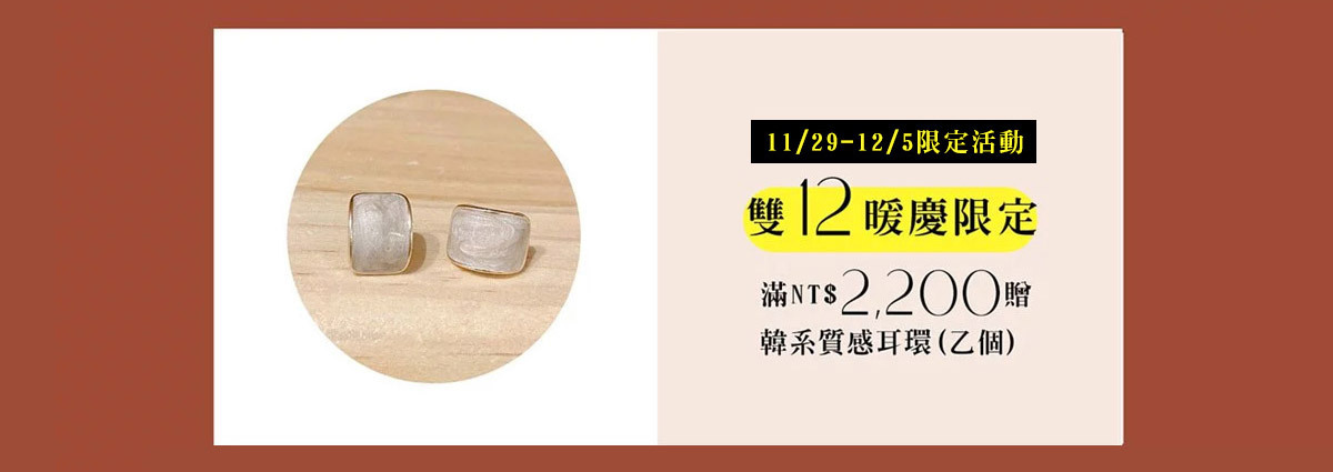 • 活動辦法 : 於11/29 - 12/5期間 ,全館消費滿NT$2,200,即韓系質感耳環(乙副)