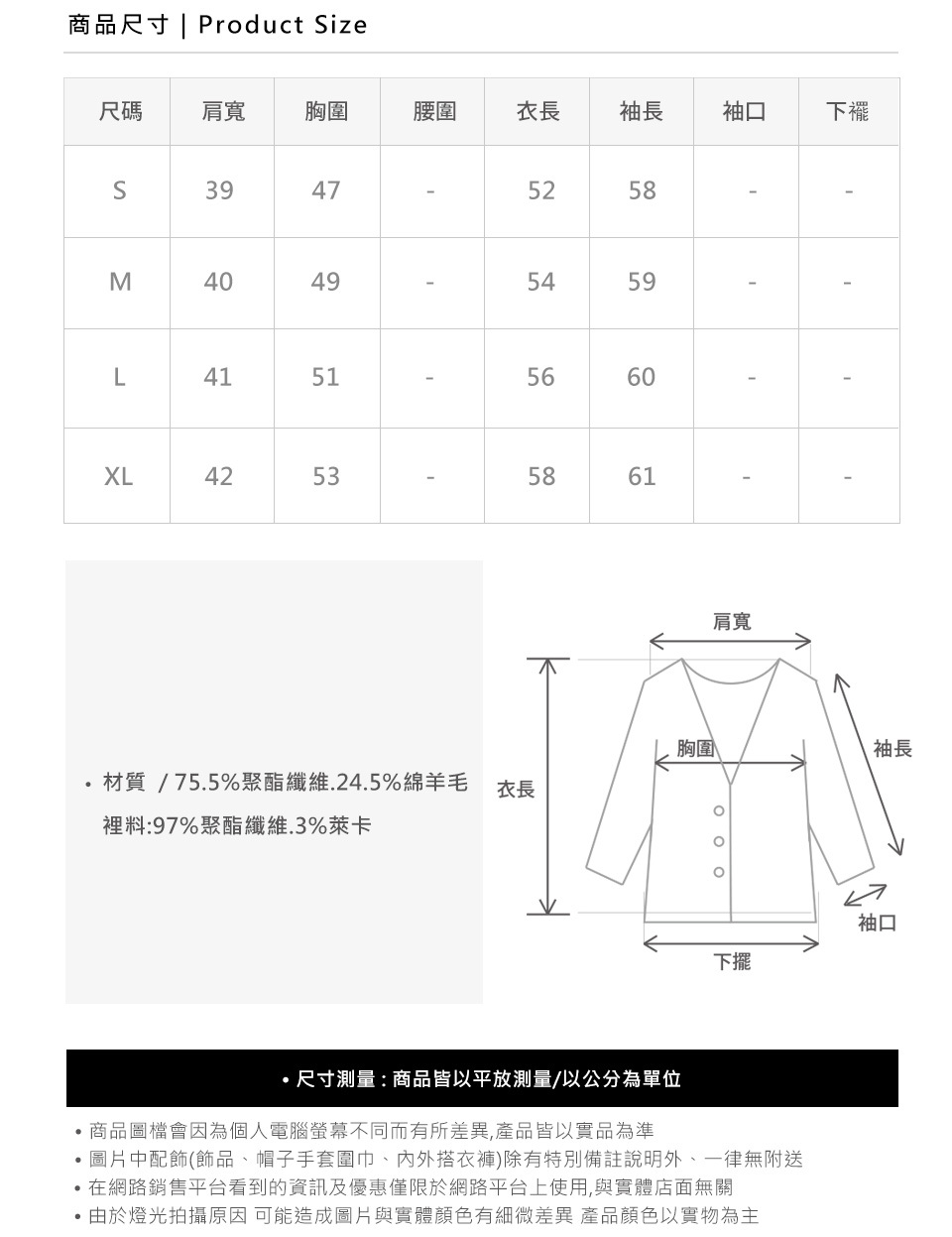 ※尺寸表為平量.單位公分CM.尺寸正負誤差2CM內為正常值